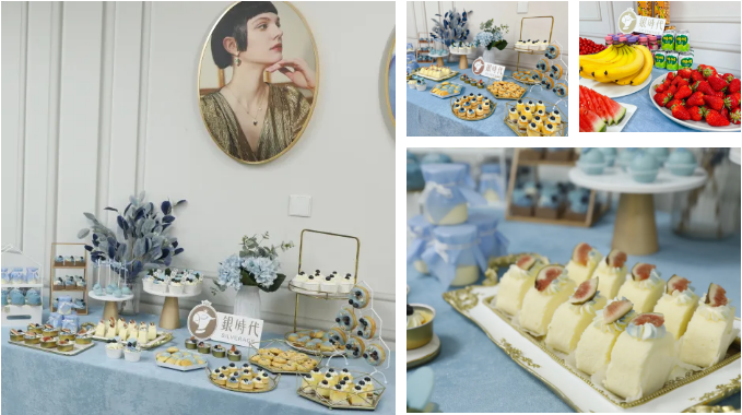 美味的蛋糕、琳琅满目的水果和饮品被陈列在桌面上,令人垂涎欲滴。